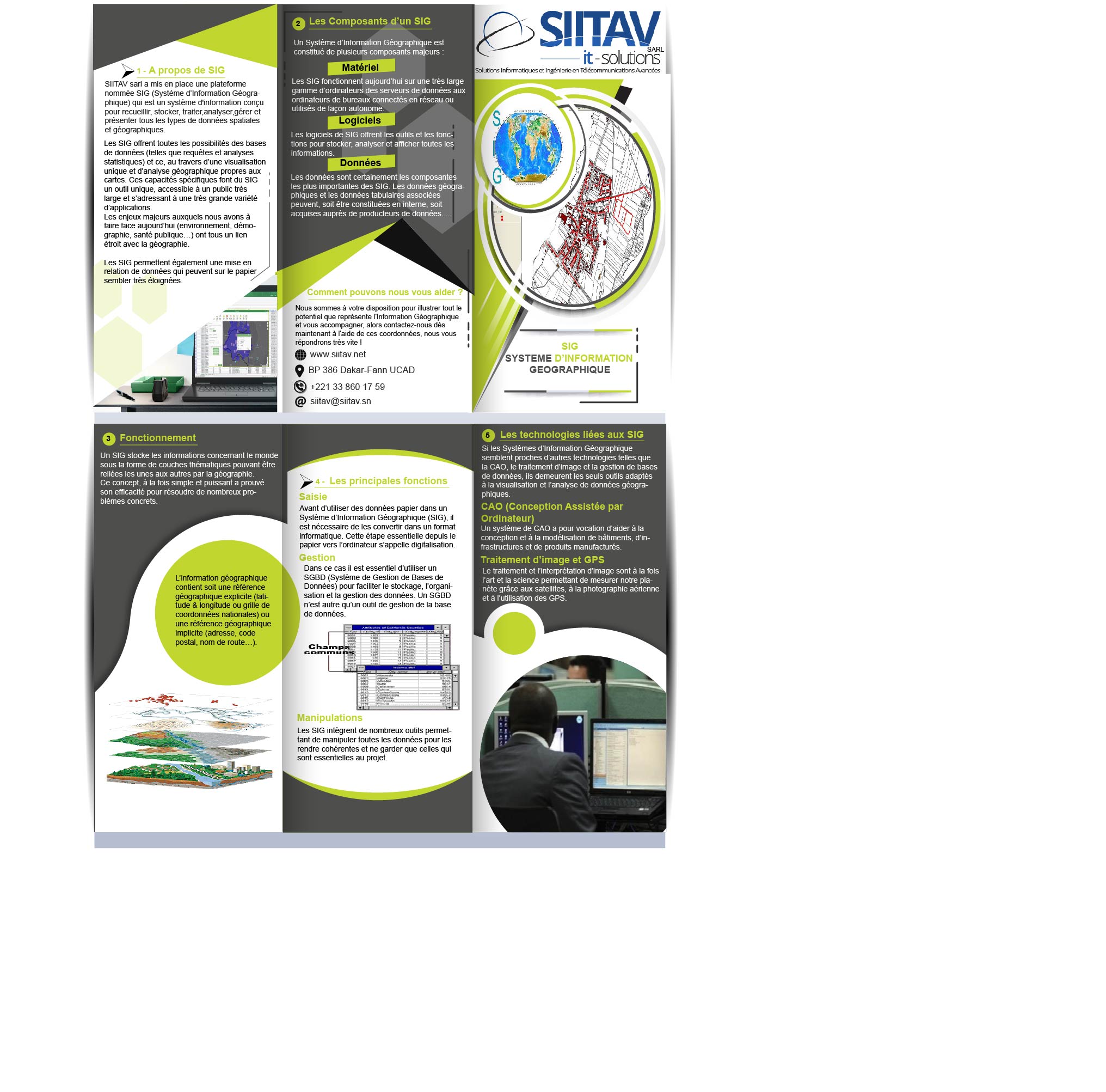 SIITAV sarl a mis en place une plateforme nommée SIG ( Systéme d’Information Géographique) qui est un système d'information conçu pour recueillir, stocker, traiter, analyser, gérer et présenter tous les types de données spatiales et géographiques.